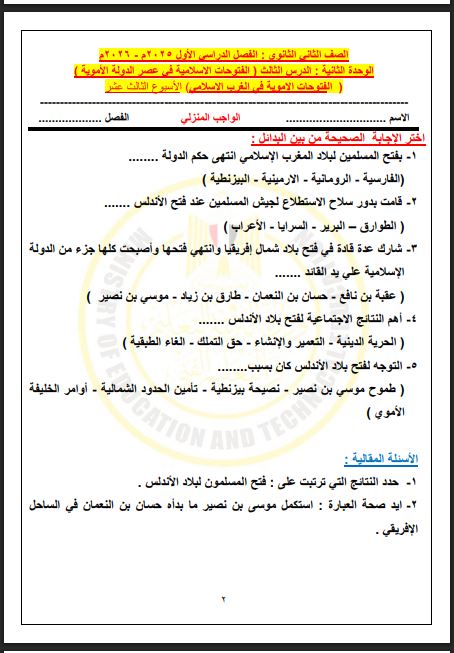 - التقييم الاسبوعي للصف الثاني الثانوي تاريخ