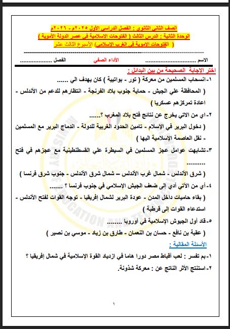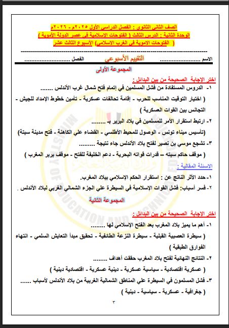 أسئلة تقييمات الأسبوع الـ 13 في التاريخ وإجابتها الصف الثاني الثانوي 2025