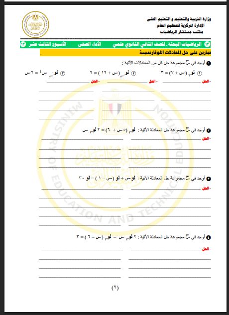 مراجعات نهائية.. أسئلة تقييم الأسبوع الـ 13 الرياضيات البحتة الصف الثاني الثانوي