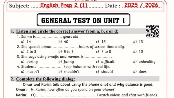 مراجعات نهائية.. نماذج امتحانات اللغة الإنجليزية لـ الصف الثاني الإعدادي، تضمن لك التفوق، للعام الدراسي الجاري 2025-2026، في مراجعات نهائيه وتحميل بنك أسئلة وإجابتها في جميع أجزاء منهج اللغة الإنجليزية ثانية اعدادي، تضمن لك التفوق، حيث يواصل موقع السبورة نشر مراجعة ليلة الامتحان من خلال تحميل نماذج امتحانات اللغة الإنجليزية، من خلال مراجعات نهائيه، واستعراض جميع نظام أسئلة امتحانات مادة اللغة الإنجليزية، وشرح مبسط، واستعراض بنك أسئلة وإجابتها في جميع أجزاء منهج اللغة الإنجليزية أولى اعدادي، عن طريق نشر العديد من الامتحانات، لطلاب وطالبات الصف الثاني الإعدادي، في مراجعات نهائيه، لن يخرج عنها امتحان آخر العام، ومن خلال متابعة مراجعات نهائيه أعدها خبراء المادة في وزارة التربية والتعليم.