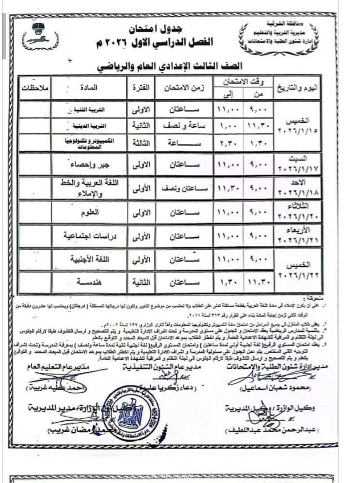 جدول امتحانات الشهادة الإعدادية الترم الأول محافظة الشرقية