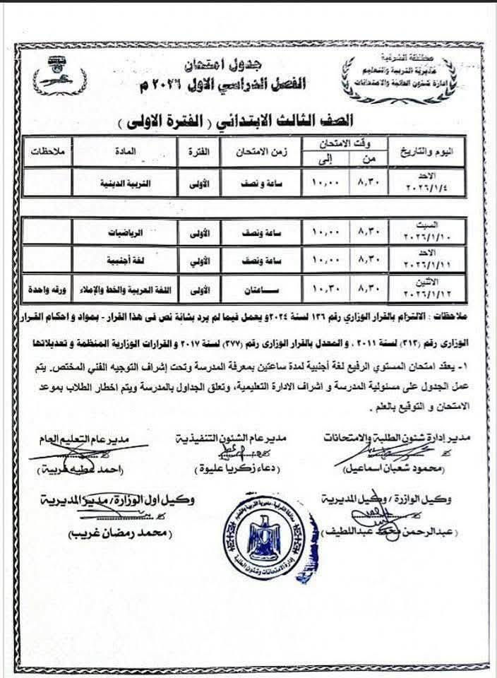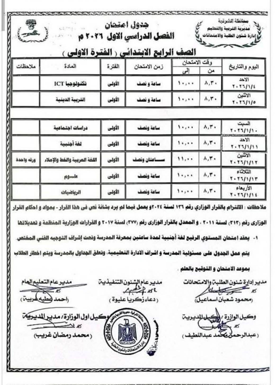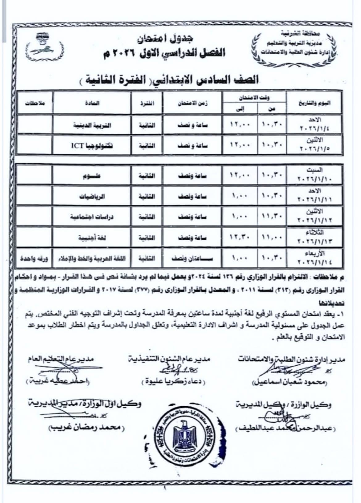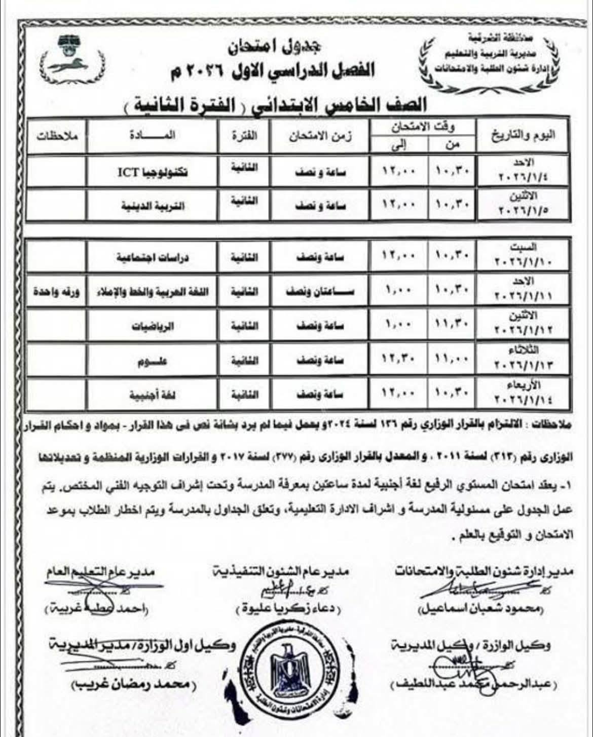 جداول امتحانات الترم الأول 2026 لصفوف النقل الابتدائي بمحافظة الشرقية