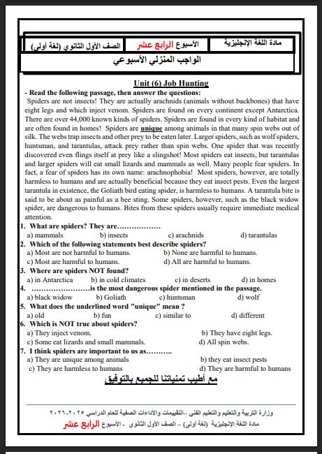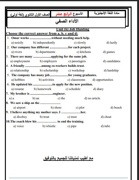 - أول ثانوي اللغة الإنجليزية تقييم الأسبوع الـ 14