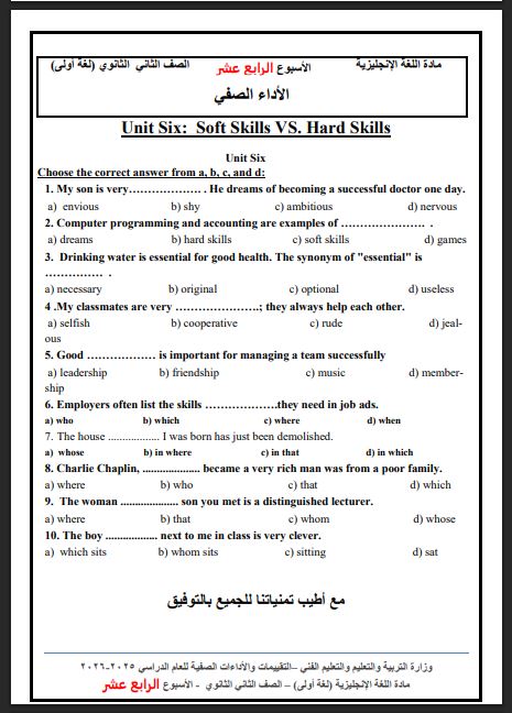 مراجعات نهائية.. أسئلة تقييم الأسبوع الـ 14 اللغة الإنجليزية الصف الثاني الثانوي، للعام الدراسي الجاري 2025-2026، في مراجعات نهائية وتحميل أسئلة تقييم الأسبوع الـ 14 اللغة الإنجليزية الصف الثاني الثانوي، حيث يواصل موقع السبورة نشر مراجعة ليلة الامتحان من خلال تحميل أقوى أسئلة تقييم الأسبوع الـ 14 الصف الثاني الثانوي اللغة الانجليزية، لطلاب وطالبات الصف الثاني الثانوي، من خلال مراجعات نهائيه، واستعراض جميع نظام أسئلة امتحانات اللغة الإنجليزية، وشرح مبسط، واستعراض لجميع أسئلة مادة اللغة الإنجليزية، عن طريق نشر العديد من الامتحانات، لطلاب وطالبات الصف الثاني الثانوي، في مراجعات نهائية، لن يخرج عنها امتحان آخر العام، ومن خلال متابعة مراجعات نهائية أعدها خبراء المادة في وزارة التربية والتعليم.