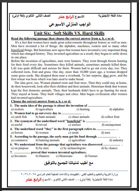 - تقييمات الأسبوع الـ 14 الصف الثاني الثانوي