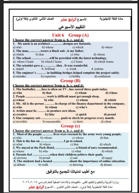 - التقييم الاسبوعي للصف الثاني الثانوي إنجليزي