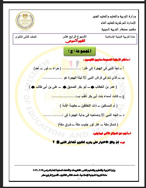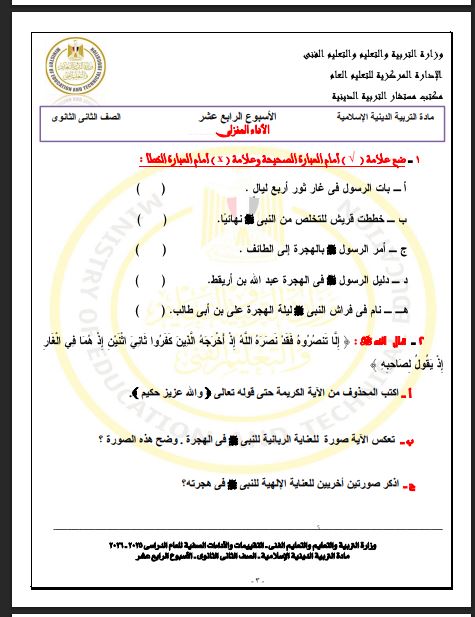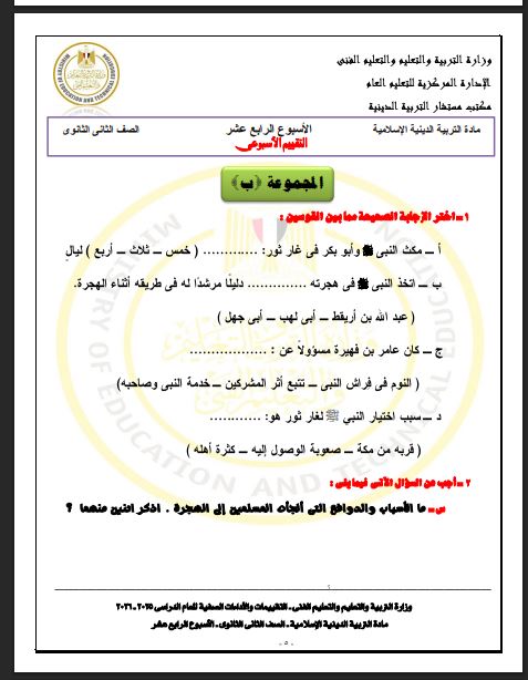 أسئلة تقييم الأسبوع الـ 14 التربية الاسلامية ثانية ثانوي
