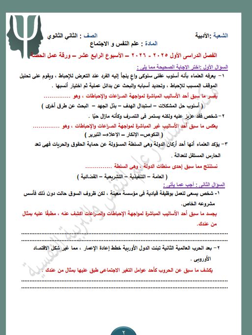 لطلاب الصف الثاني الثانوي.. أسئلة تقييمات الأسبوع الـ 14 علم النفس والاجتماع