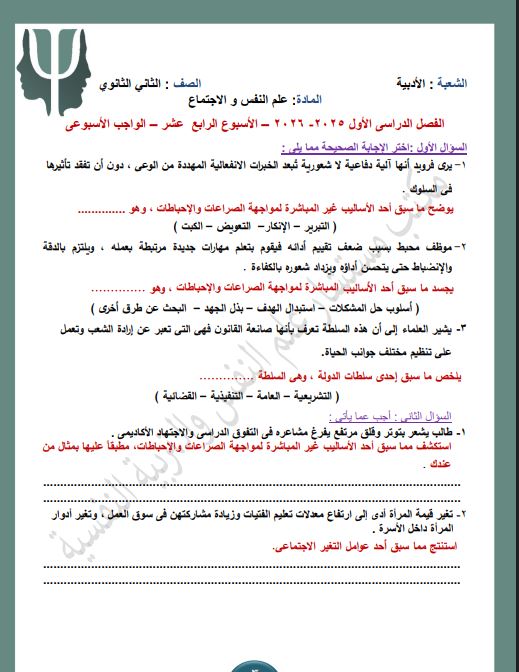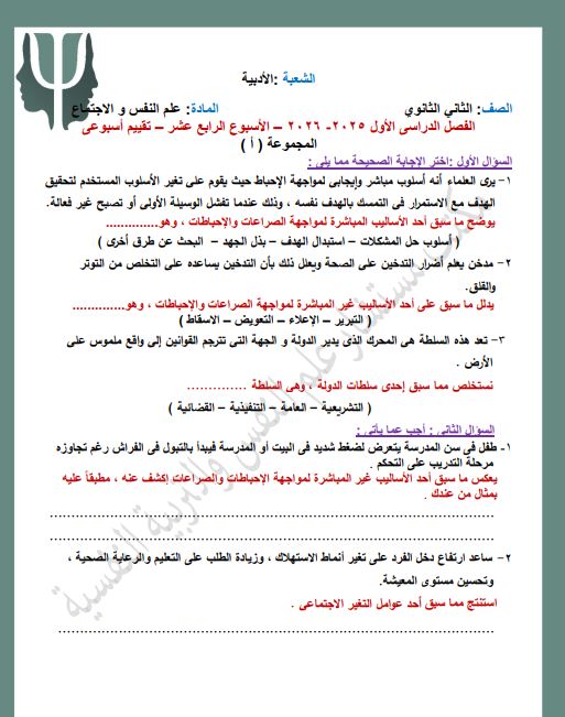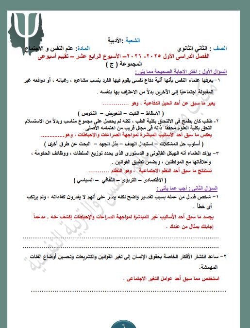 - التقييم الاسبوعي للصف الثاني الثانوي علم النفس والاجتماع