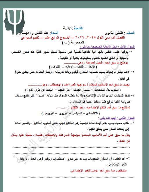 - حل التقييم الاسبوعي للصف الثاني الثانوي علم النفس والاجتماع