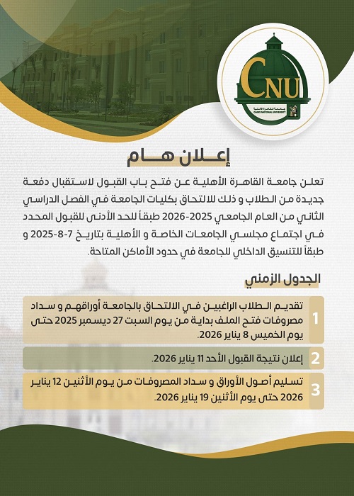 في خطوة تعكس التزام جامعة القاهرة الأهلية بتوسيع فرص الالتحاق بالتعليم الجامعي المتميز، أعلنت الجامعة فتح باب القبول لاستقبال دفعة جديدة من الطلاب للالتحاق بكليات جامعة القاهرة الأهلية خلال الفصل الدراسي الثاني من العام الجامعي 2025-2026، وذلك وفقًا للحدود الدنيا المعتمدة بقرار مجلسي الجامعات الخاصة والأهلية، وفي إطار التنسيق الداخلي لـ جامعة القاهرة الأهلية وطبقًا للأماكن المتاحة.