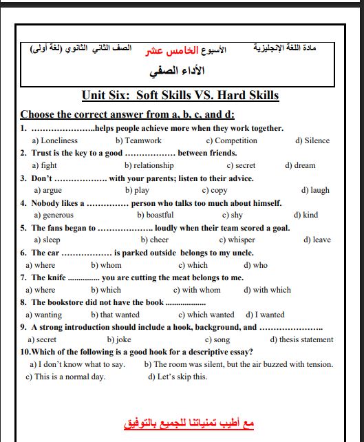 اسئلة تقييم اللغة الإنجليزية في الأسبوع الـ 15 الصف الثاني الثانوي
