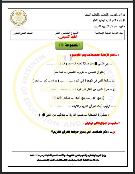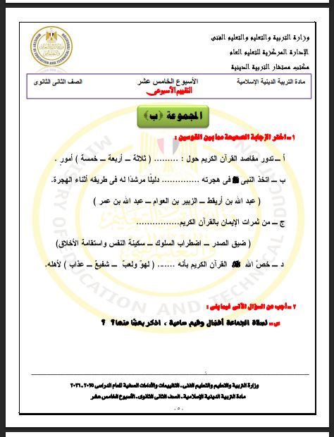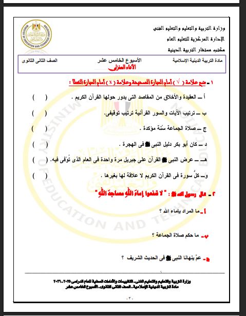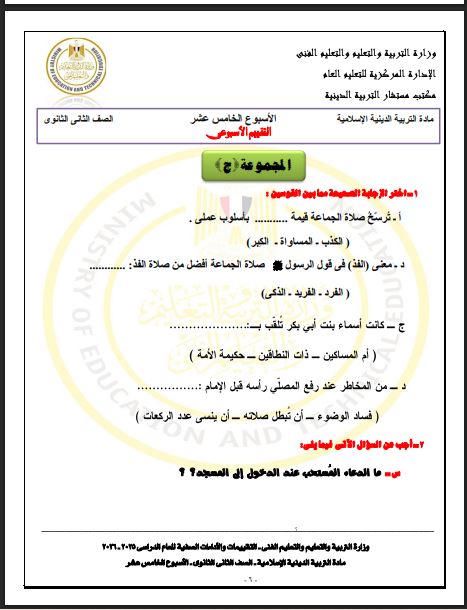 أسئلة تقييم الأسبوع الـ 15 التربية الاسلامية ثانية ثانوي