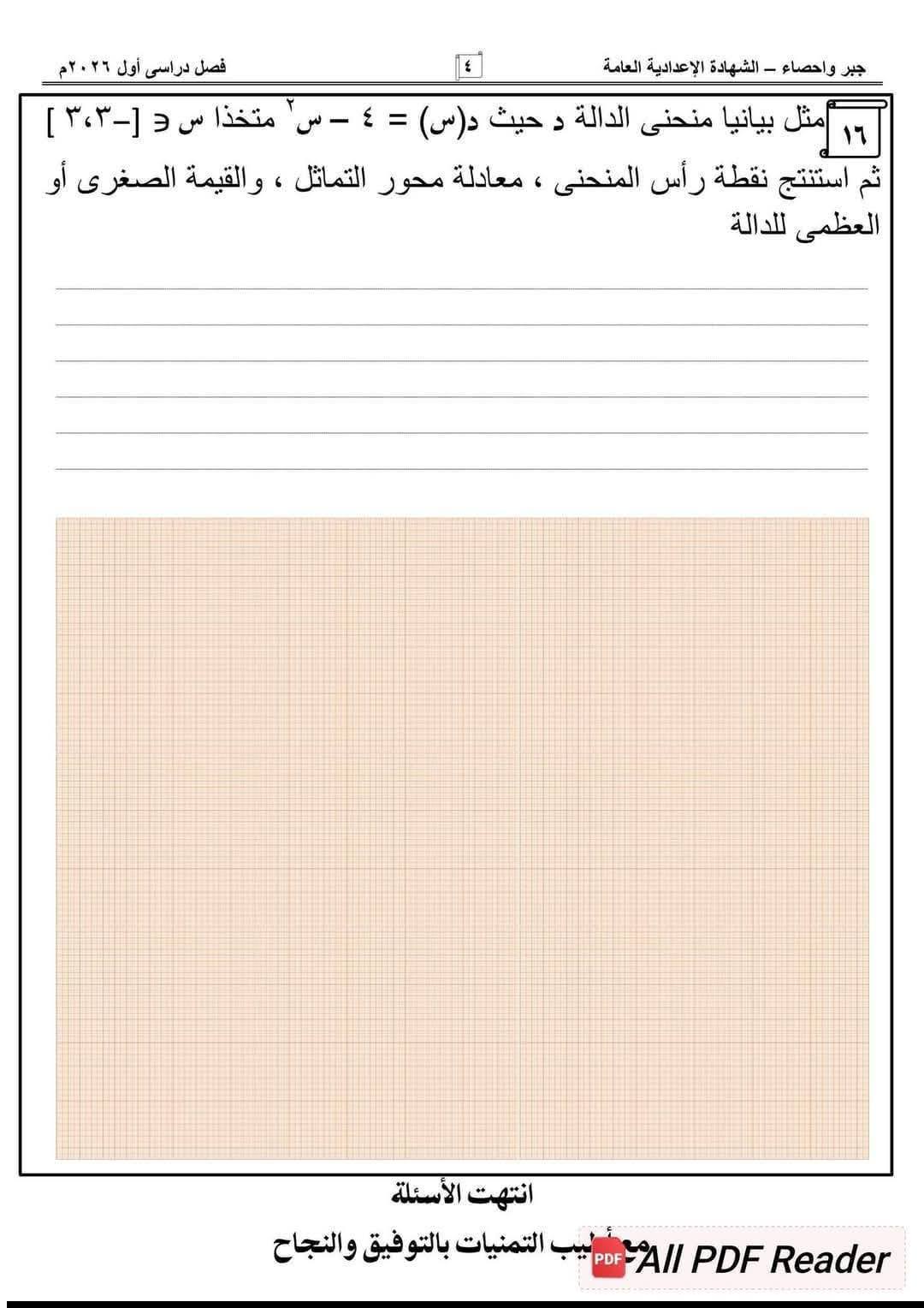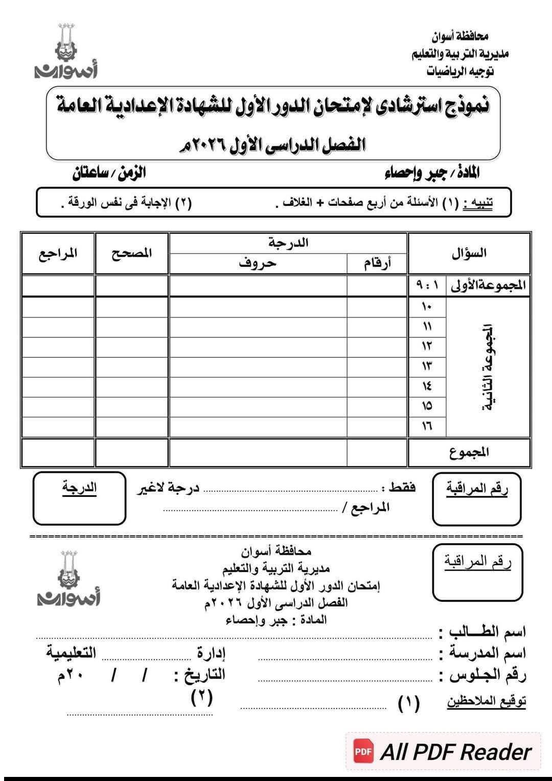 نموذج استرشادي في الجبر والاحصاء لـ الشهادة الإعدادية 2026