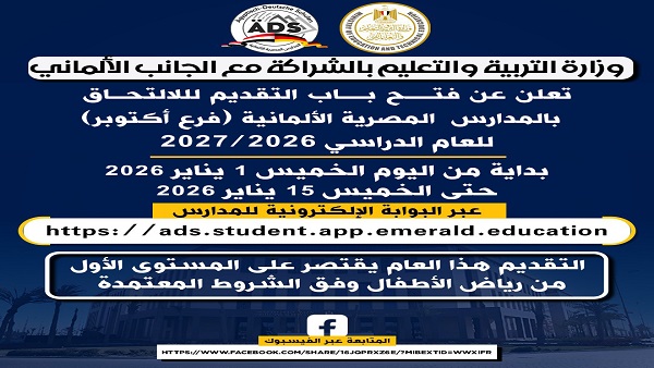 تُعلن وزارة التربية والتعليم والتعليم الفني عن بدء التقديم في المدرسة المصرية الألمانية فرع مدينة أكتوبر للعام الدراسي 2026 – 2027، للمرحلة الأولى من رياض الأطفال KG1. وتستمر فترة التقديم لمدة 15 يومًا، اعتبارًا من الخميس 1 يناير 2026 وحتى الخميس 15 يناير 2026، وفق الرابط الإلكتروني الرسمي للمدرسة.