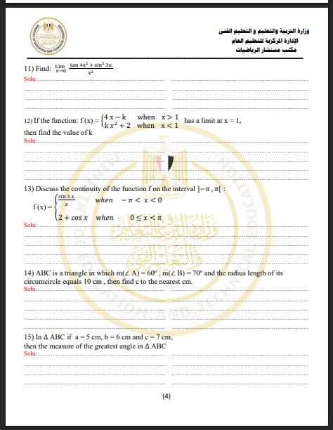 مراجعات نهائية أسئلة تقييم الأسبوع الـ 15 الرياضيات البحتة لغات