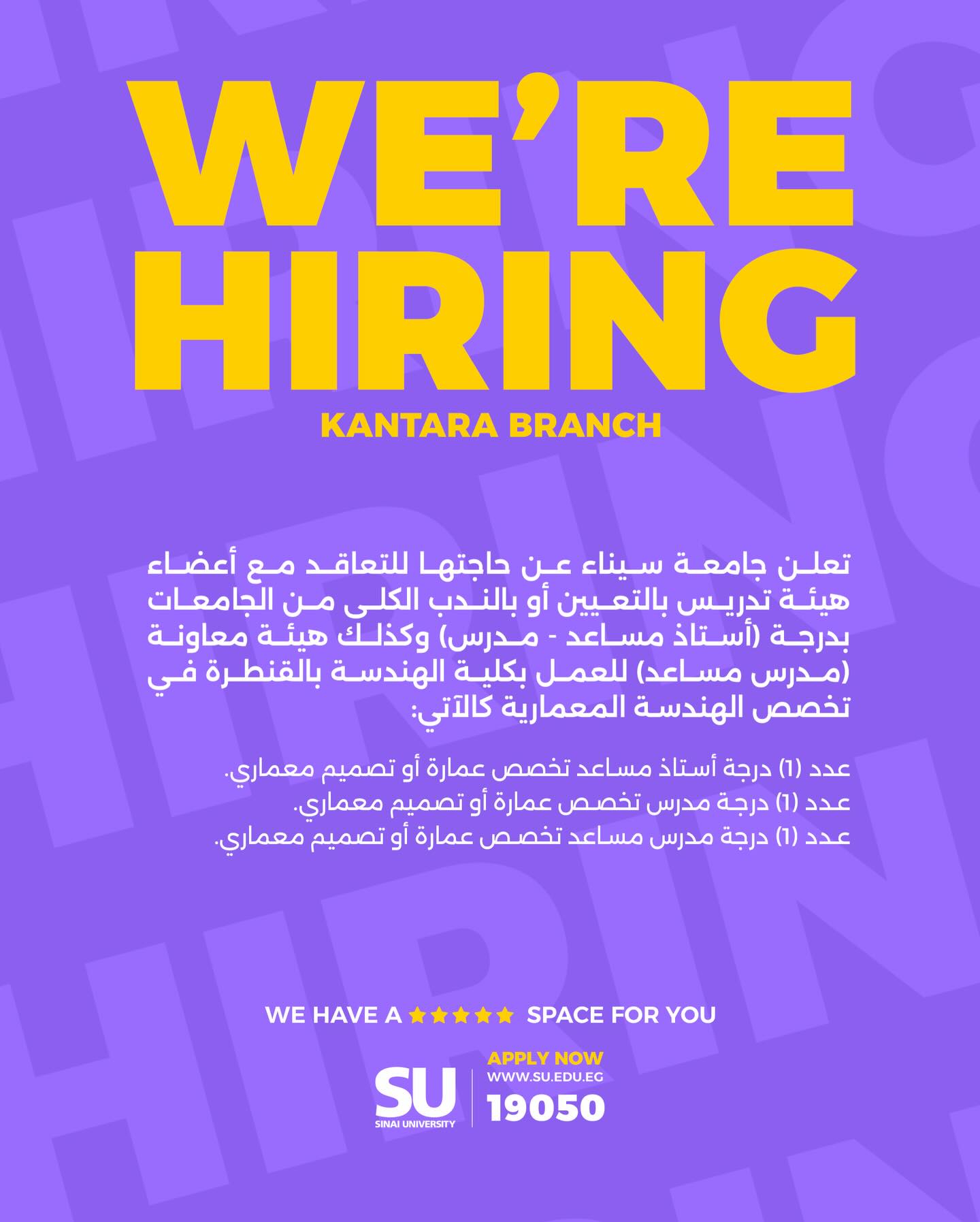 تعلن جامعة سيناء عن حاجتها للتعاقد مع أعضاء هيئة تدريس بالتعيين أو بالندب الكلى من الجامعات بدرجة أستاذ مساعد - مدرس) وكذلك هيئة معاونة (مدرس مساعد للعمل بكلية الهندسة بالقنطرة في تخصص الهندسة المعمارية، وعلى الراغبين في الحصول على وظائف جامعة سيناء، الدخول على موقع جامعة سيناء، عبر شبكة الانترنت، والتقديم متاح الآن.