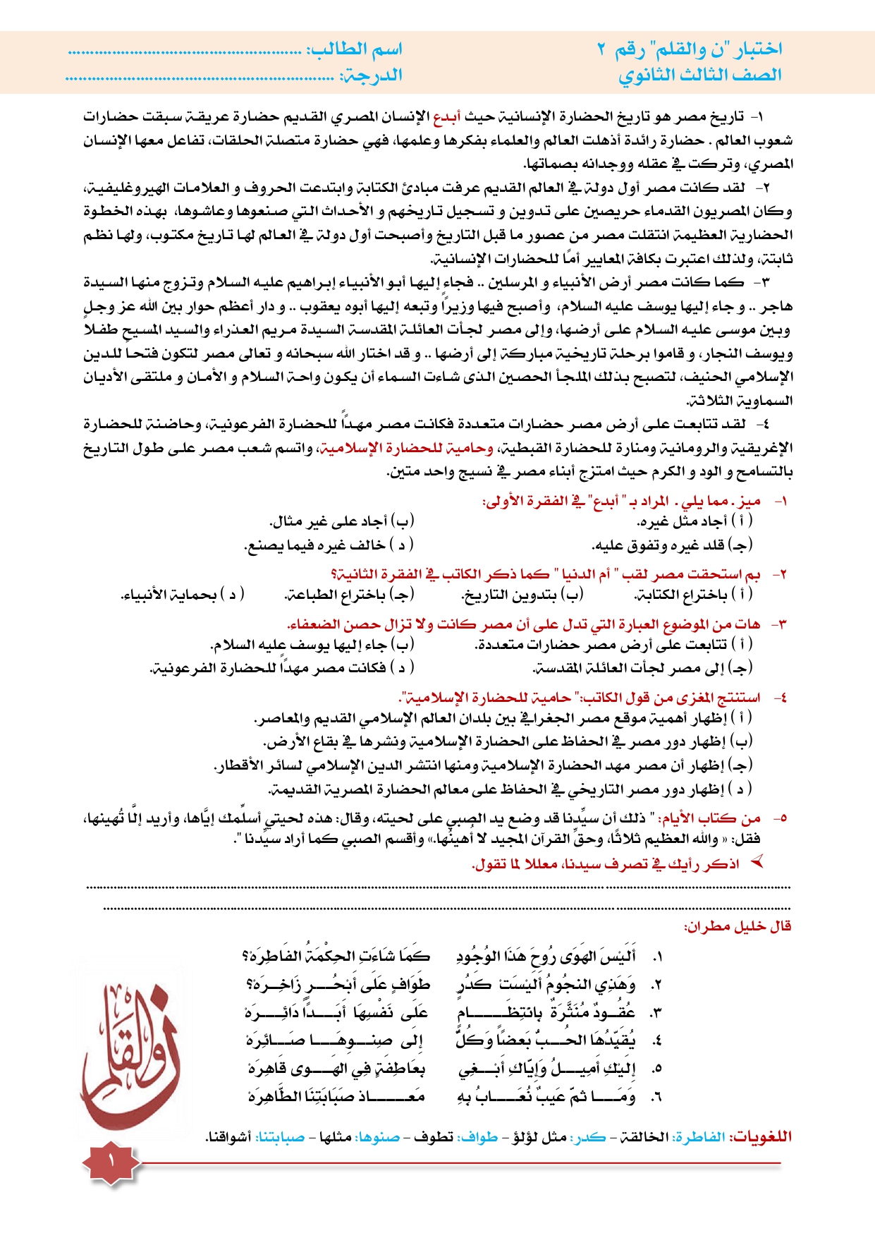 مراجعات نهائية.. اختبار لغة عربية وإجابتها لـ الثانوية العامة 2026