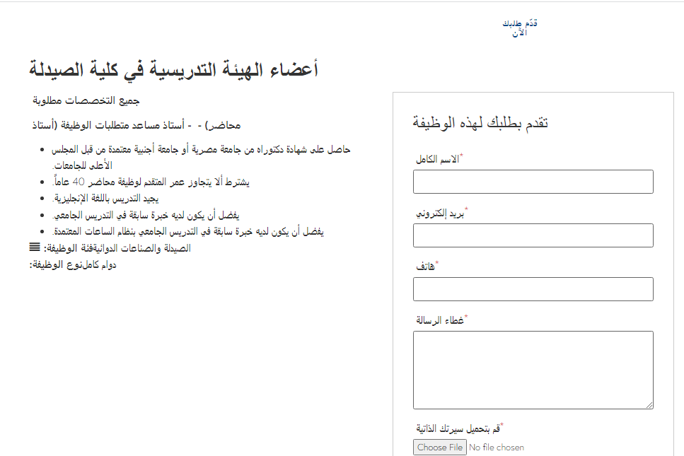 وتعد هذه الفرصة مناسبة للراغبين في العمل الأكاديمي داخل جامعة تسعى إلى التطوير المستمر وتوفير بيئة تعليمية وبحثية داعمة، بما يحقق التوازن بين الجانب النظري والتطبيقي في دراسة علوم الصيدلة.