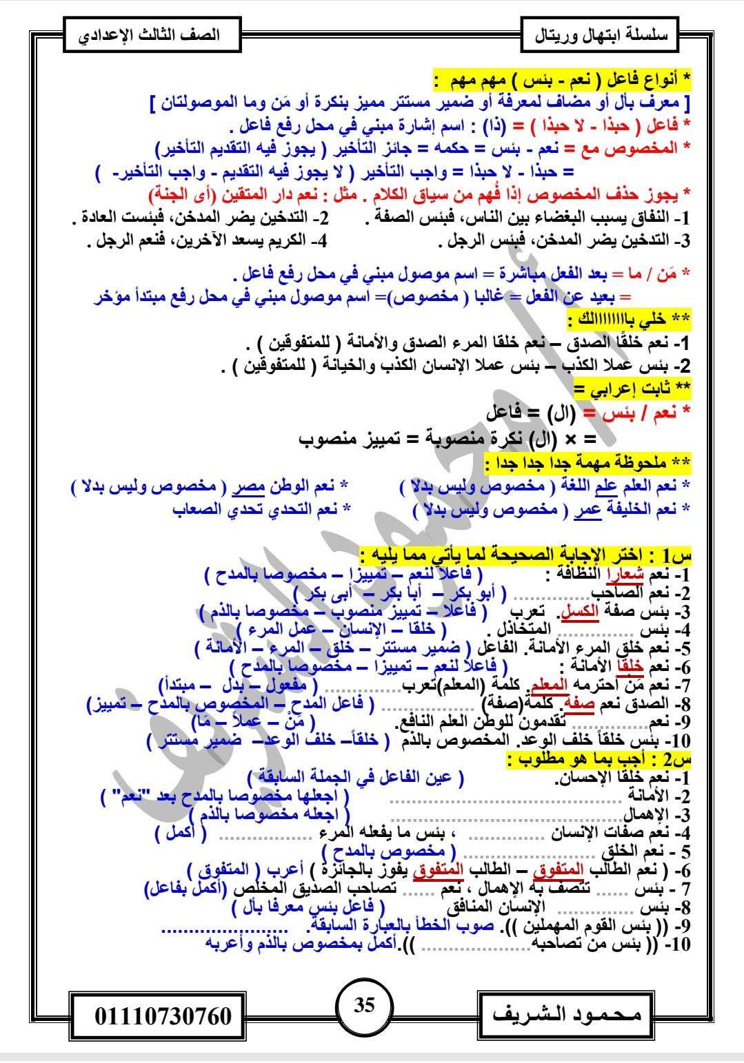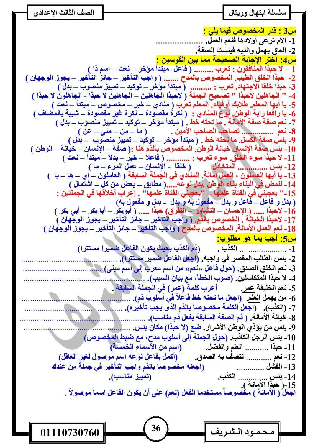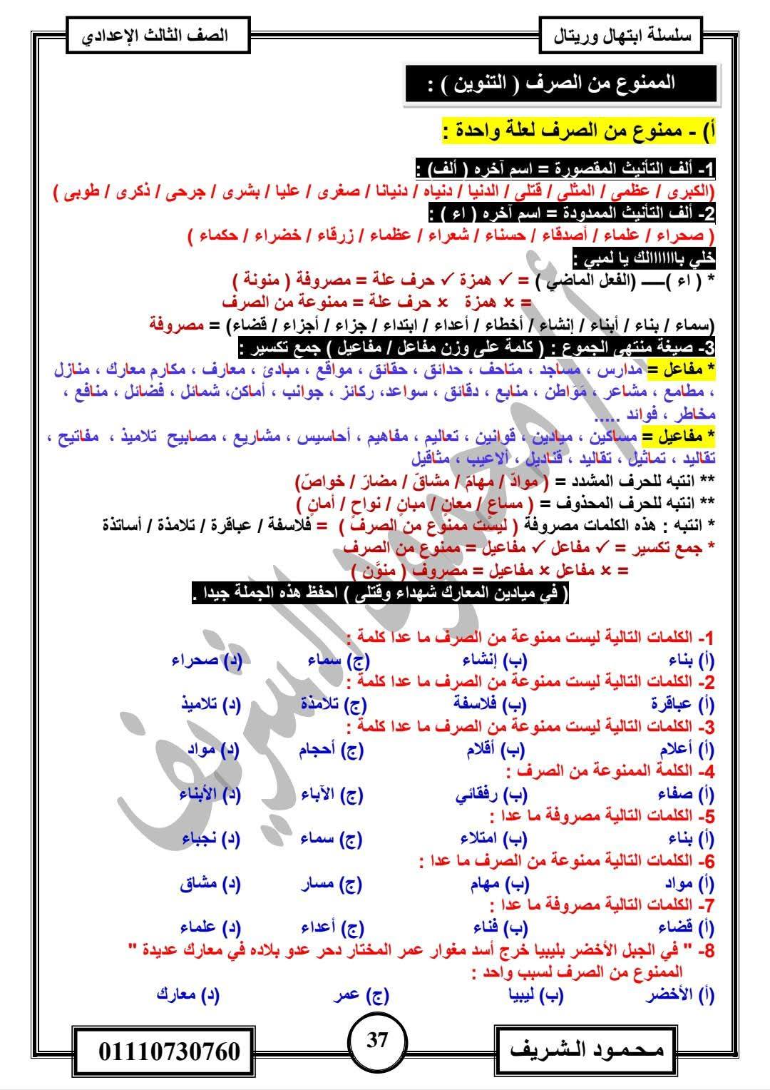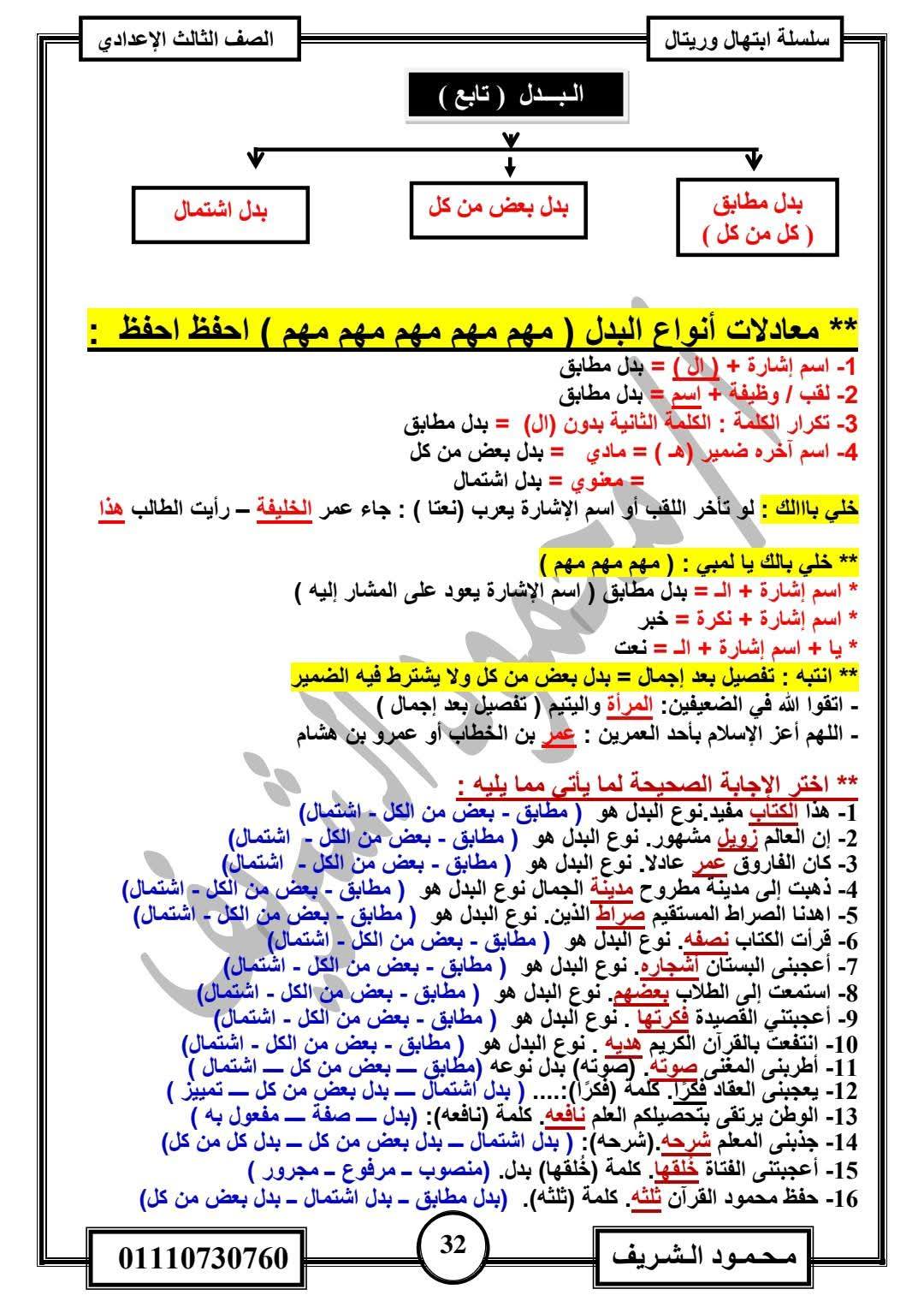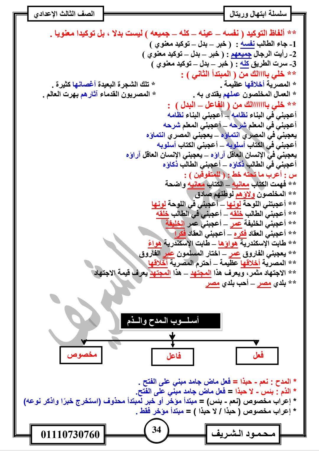 - اللغة العربية مراجعات نهائية الصف الثالث الإعدادي