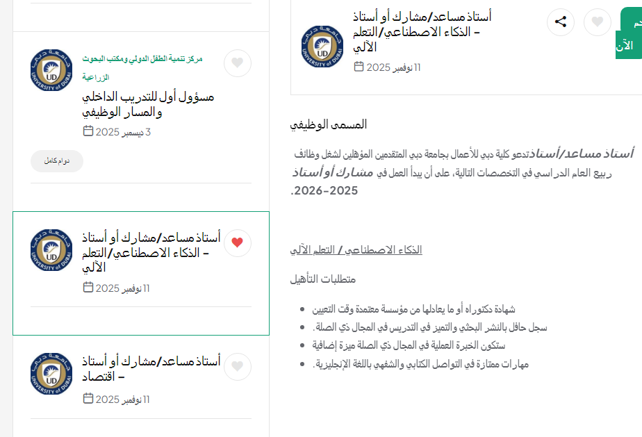 وظيفة جامعة .. تعلن كلية دبي للأعمال في جامعة دبي عن فتح باب التقديم للوظائف الأكاديمية الشاغرة في مجال الذكاء الاصطناعي والتعلم الآلي، للانضمام إلى فريقها الأكاديمي بدءًا من ربيع العام الدراسي 2025-2026.