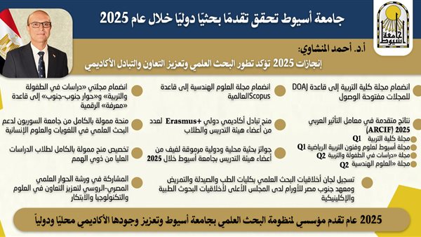 وأكد الدكتور أحمد المنشاوي، رئيس جامعة أسيوط، أن ما تحقق من إنجازات بحثية خلال 2025 يُعد ترجمة حقيقية لتكامل منظومة البحث العلمي بالجامعة، وتعزيز التعاون الأكاديمي مع كبرى المؤسسات والجامعات الدولية.