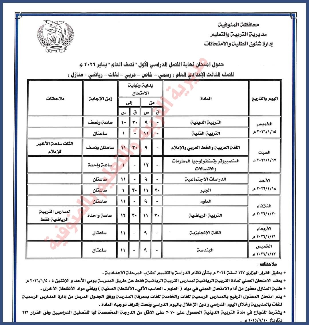 - جدول امتحانات الشهادة الإعدادية لمحافظة المنوفية