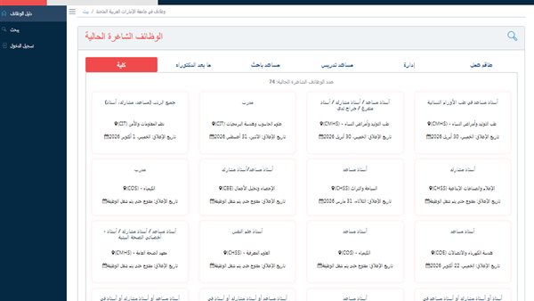 وبلغ إجمالي عدد الوظائف المعلنة حاليًا نحو 74 وظيفة، موزعة على كليات الجامعة المختلفة، وتشمل وظائف لأعضاء هيئة التدريس بمختلف الرتب الأكاديمية، إضافة إلى فرص ما بعد الدكتوراه، ومساعدي التدريس والبحث، ووظائف إدارية وفنية.