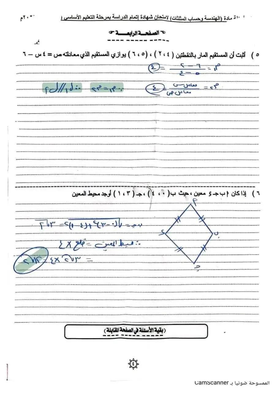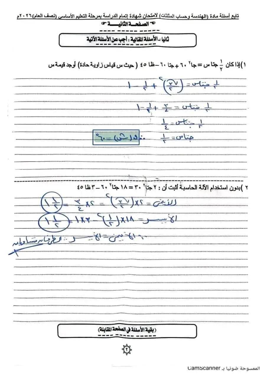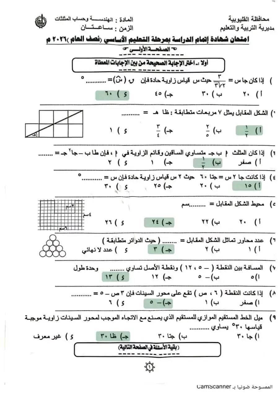 - إجابات امتحان هندسة الشهادة الإعدادية القليوبية