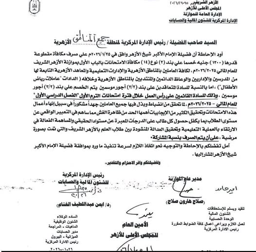 في خطوة تعكس تقدير مؤ سسة الأزهر الشريف لجهود أبنائها المخلصين، وافق فضيلة الإمام الأكبر الدكتور أحمد الطيب، شيخ الأزهر الشريف، على صرف مكافأة مقطوعة قدرها ١٣٠٠ جنيه لكافة العاملين بالمناطق الأزهرية والمعاهد والإدارات لتعليمية التابعة لها، وذلك نظير ما بذلوه من جهد كبير خلال أعمال امتحانات الفصل الدراسي الأول.