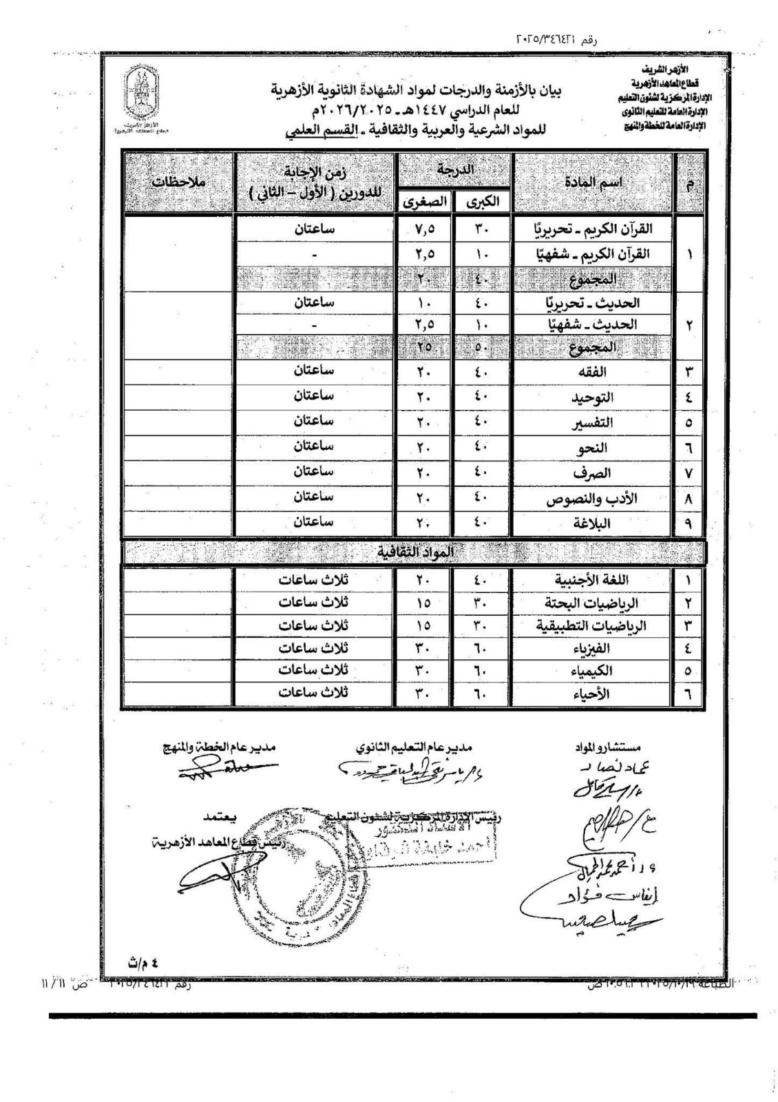 دليل درجات الشهادة الثانوية الأزهرية 2026.. القسم العلمي وتوزيع الدرجات لكل مادة