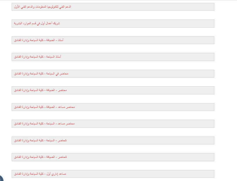 وشملت الوظائف المعلنة عددًا كبيرًا من الفرص الأكاديمية والإدارية في كلية السياحة وإدارة الفنادق، من بينها: