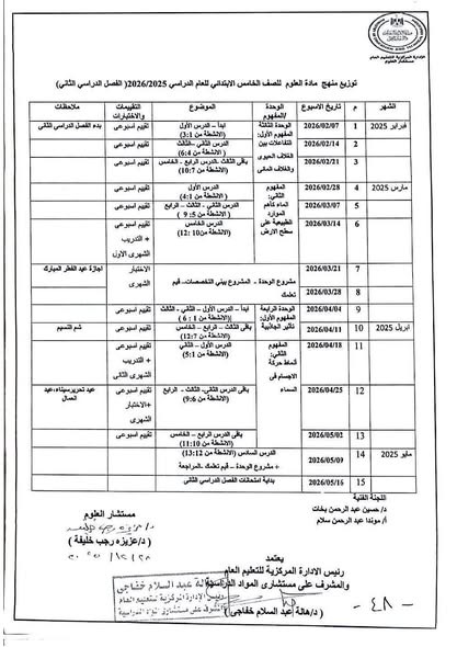 أعلن مكتب مستشار مادة العلوم، برئاسة الدكتورة عزيزة رجب خليفة، عن توزيع منهج العلوم لطلاب وطالبات الصف الخامس الابتدائي للترم الثاني للعام الدراسي 2025/2026، وسوف تنطلق الدراسة يوم السبت المقبل الموافق 7 فبراير الجاري.