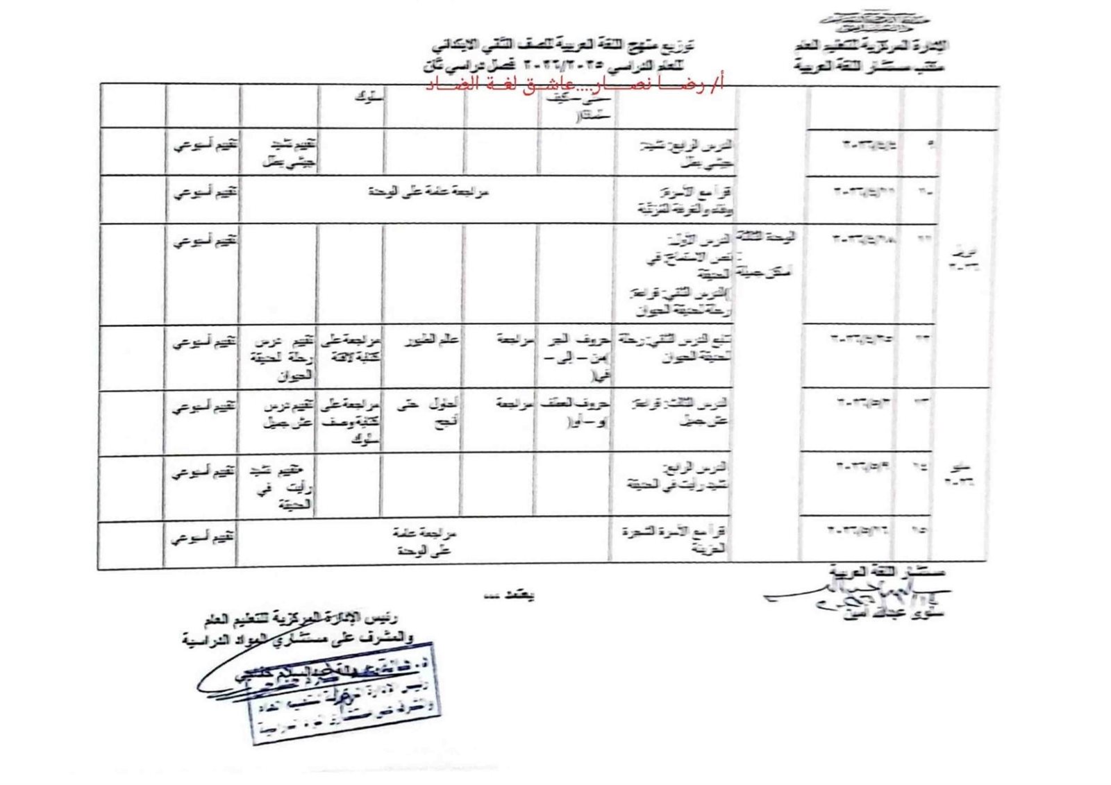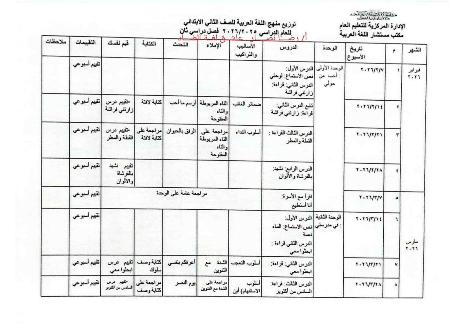 - توزيع منهج الصف الثاني الابتدائي عربي 2026