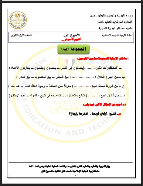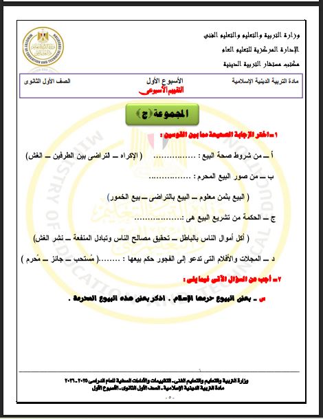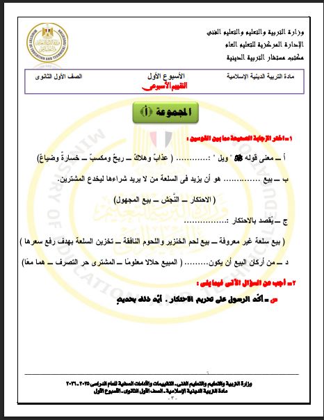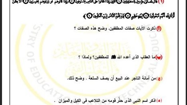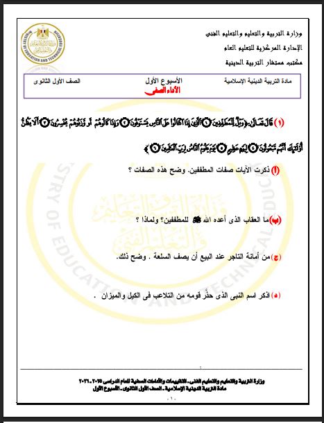 - تقييمات وزارة التربية والتعليم أولى ثانوي تربية إسلامية