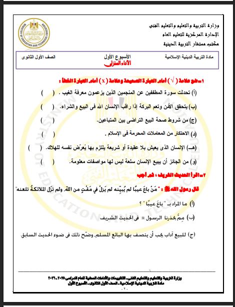 - امتحان تربية إسلامية أولى ثانوي الأسبوع الأول الترم الثاني