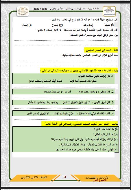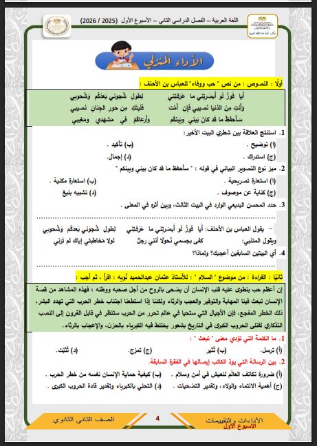 أسئلة تقييمات الأسبوع الأول اللغة العربية الصف الثاني الثانوي ترم ثاني