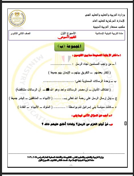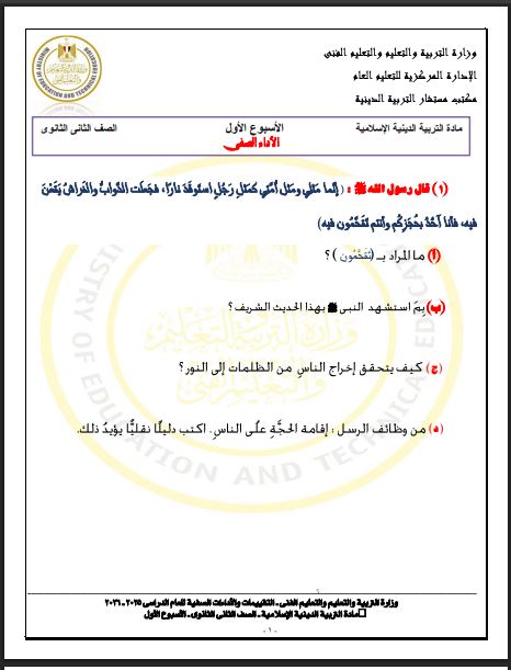 - الأسبوع الأول تقييم ثانية ثانوي التربية الاسلامية