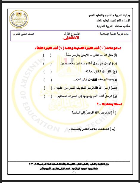 أسئلة تقييم الأسبوع الأول التربية الاسلامية ثانية ثانوي