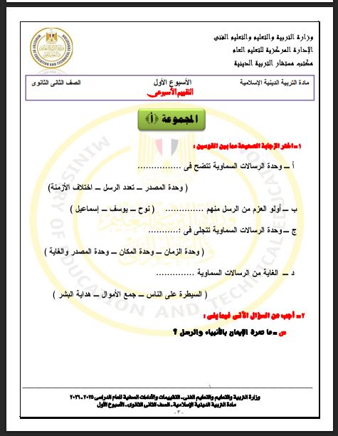 - التقييم الاسبوعي للصف الثاني الثانوي التربية الاسلامية