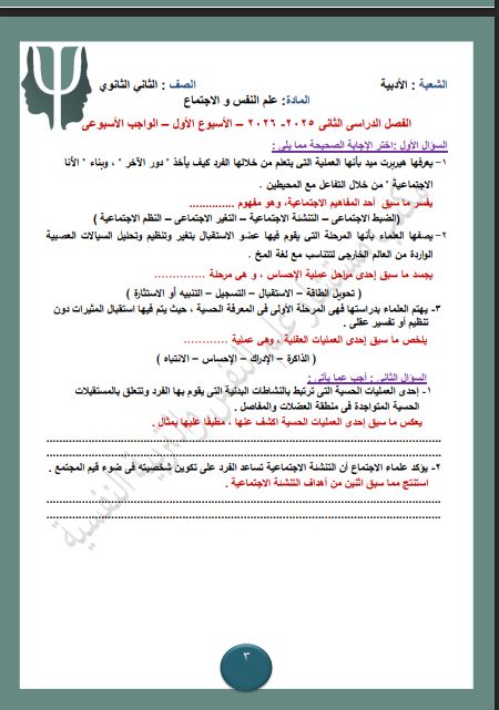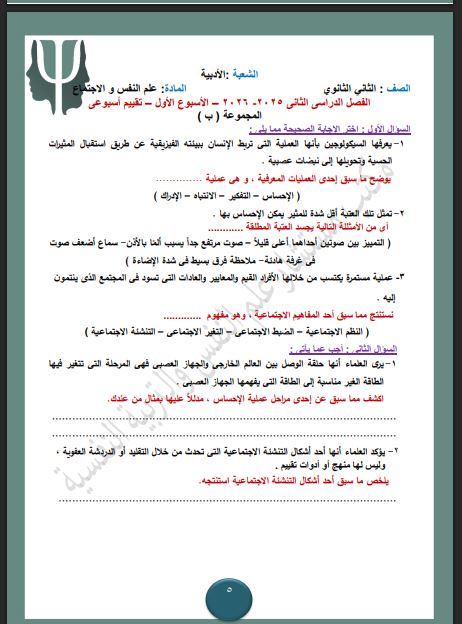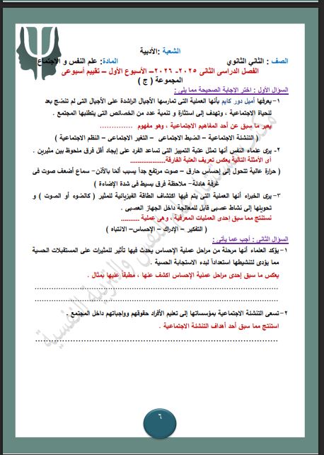 - التقييم الاسبوعي للصف الثاني الثانوي علم النفس والاجتماع