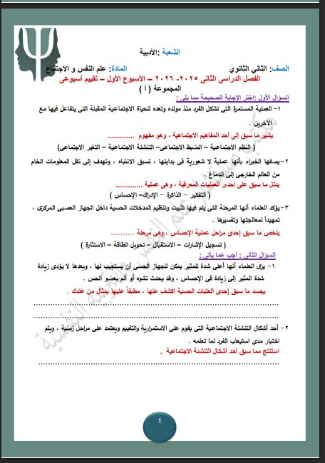 - حل التقييم الاسبوعي للصف الثاني الثانوي علم النفس والاجتماع