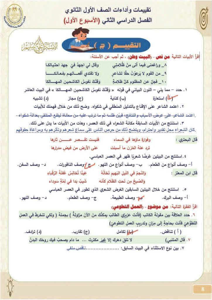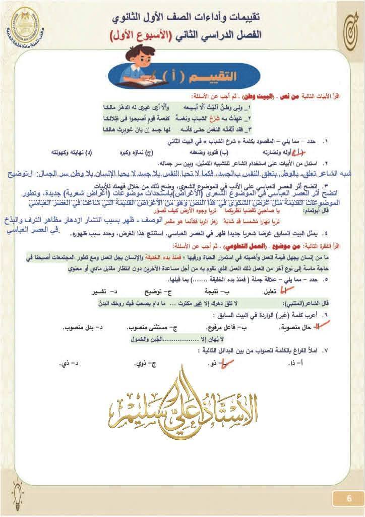 - تقييمات اللغة العربية أولى ثانوي الترم الثاني 2026