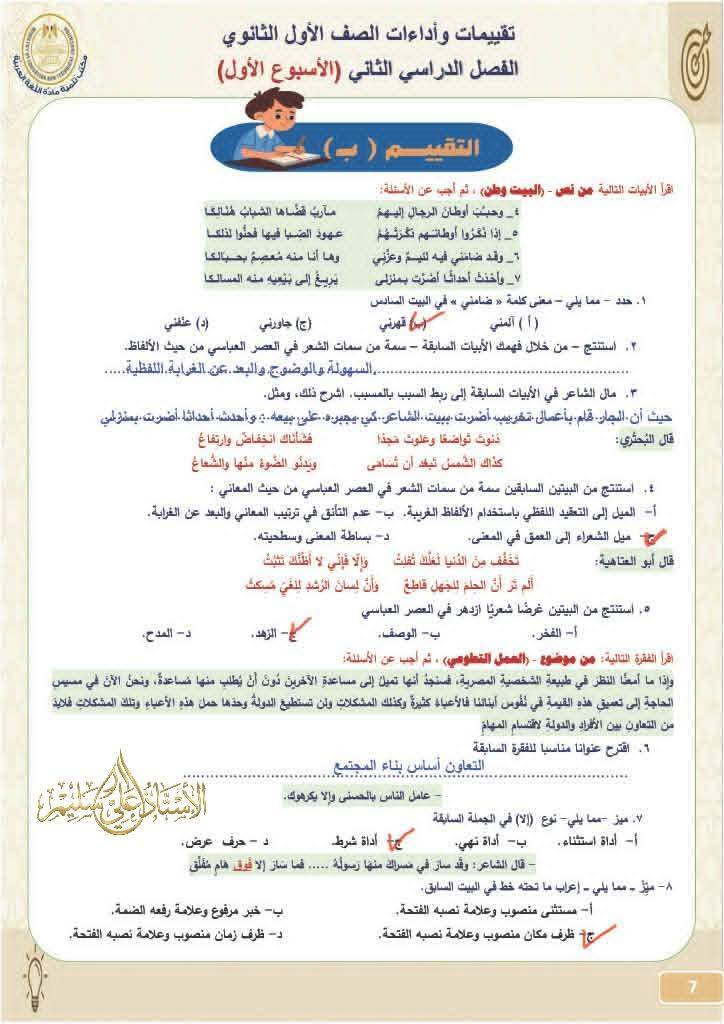 - تقييمات وزارة التربية والتعليم أولى ثانوي عربي