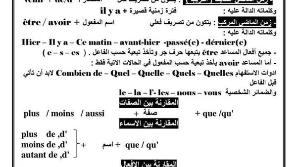 ملخص قواعد اللغة الفرنسية في 4 ورقات ثانوية عامة 2026.. ملخص اللغة الفرنسية لـ الثانوية العامة، تضمن لك دخول الامتحان وهو في جيبك، لطلاب وطالبات الثانوية العامة، من خلال ملخص اللغة الفرنسية لـ الثانوية العامة، تضمن لك مراجعات نهائية، والتى تعد مرجعا أساسيا في مراجعات نهائيه، لمقرر المنهج الدراسي للعام الدراسي الجاري 2025-2026، أعدها خبراء المادة في وزارة التربية والتعليم، من أجل مراجعات نهائيه لطلاب الثانوية العامة.