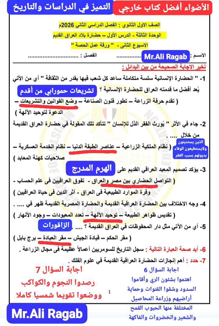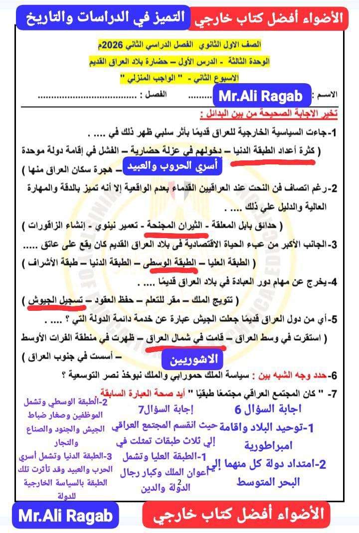 أسئلة تقييمات الأسبوع الثاني في التاريخ بالاجابات ترم ثاني أولى ثانوي