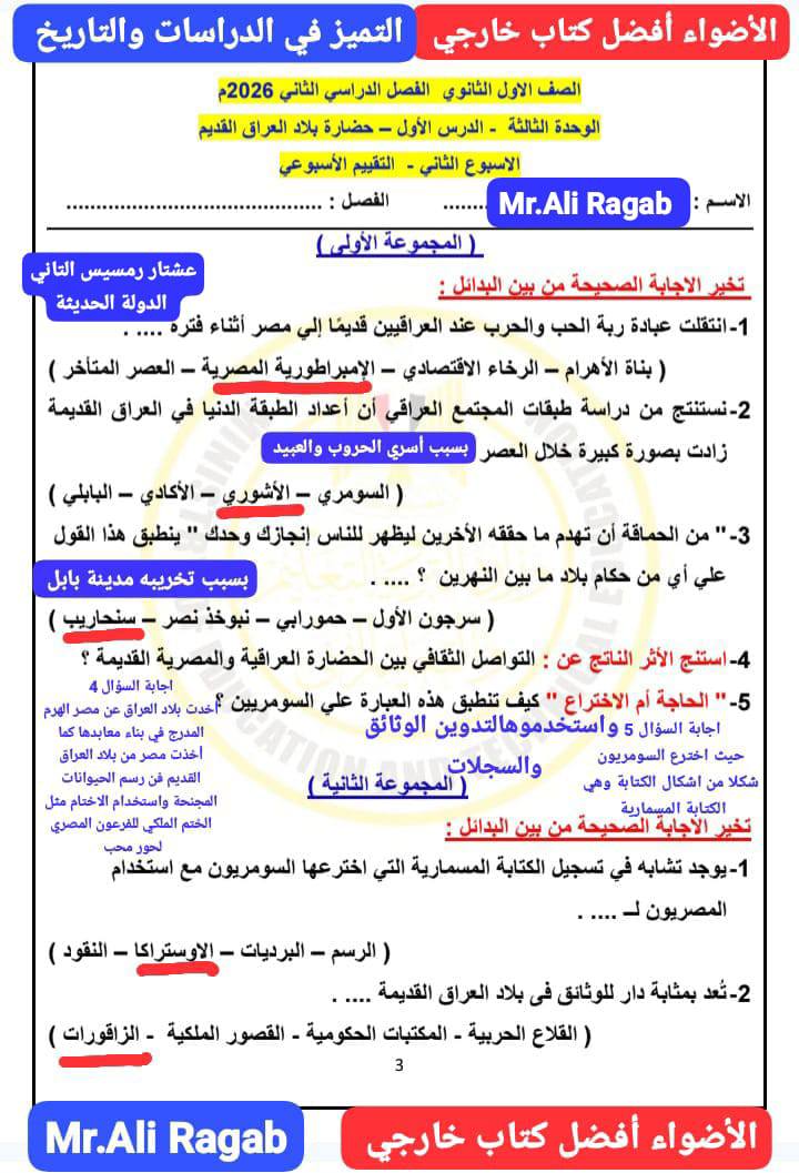 - أسئلة التاريخ أولى ثانوي الأسبوع الثاني 2026