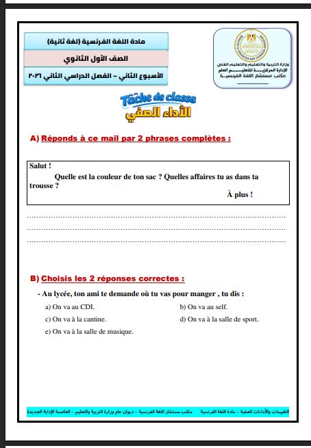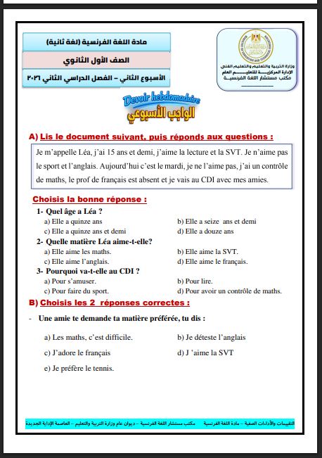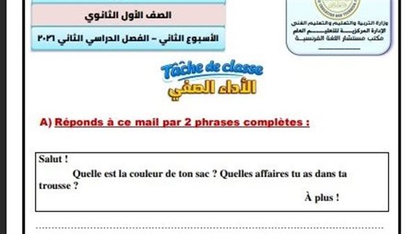 - حل التقييم الاسبوعي للصف الأول الثانوي الفرنساوي الأسبوع الثاني في اللغة الفرنسية