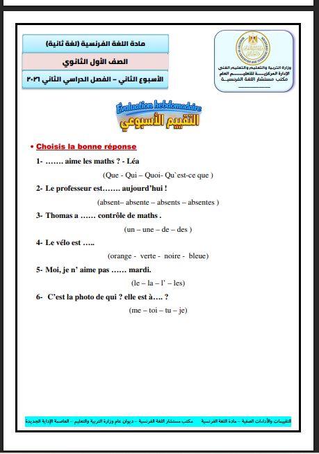 تقيمات الاسبوع الثاني لغة فرنسية.. حل أسئلة تقييم الأسبوع الثاني في اللغة الفرنسية الصف الأول الثانوي، للعام الدراسي الجاري 2025-2026، في مراجعات نهائية وتحميل حل أسئلة تقييم الأسبوع الثاني في اللغة الفرنسية الصف الأول الثانوي، حيث يواصل موقع السبورة نشر مراجعة ليلة الامتحان من خلال تحميل حل تقييم الأسبوع الثاني في اللغة الفرنسية، من خلال مراجعات نهائيه، واستعراض جميع نظام أسئلة امتحانات الأول، وشرح مبسط، واستعراض لجميع أسئلة مادة اللغة الفرنسية، عن طريق نشر العديد من الامتحانات، لطلاب وطالبات الصف الأول الثانوي، في مراجعات نهائية، لن يخرج عنها امتحان آخر العام، ومن خلال متابعة مراجعات نهائية أعدها خبراء المادة في وزارة التربية والتعليم.