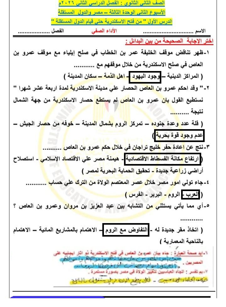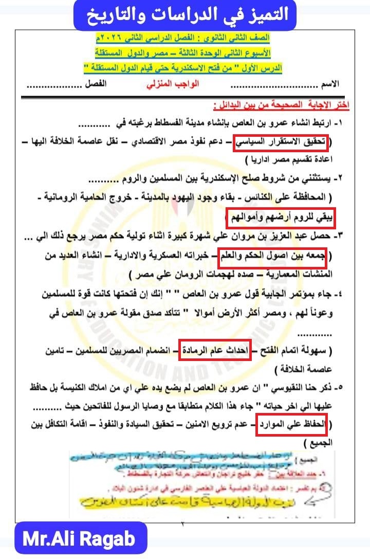 أسئلة تقييمات الأسبوع الثاني في التاريخ وإجابتها الصف الثاني الثانوي 2026